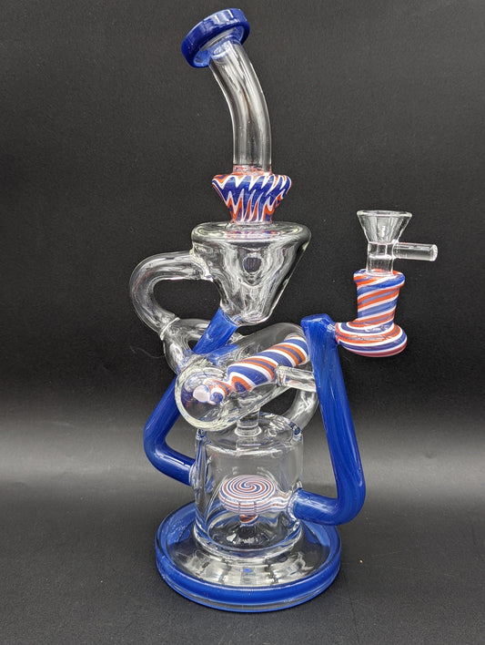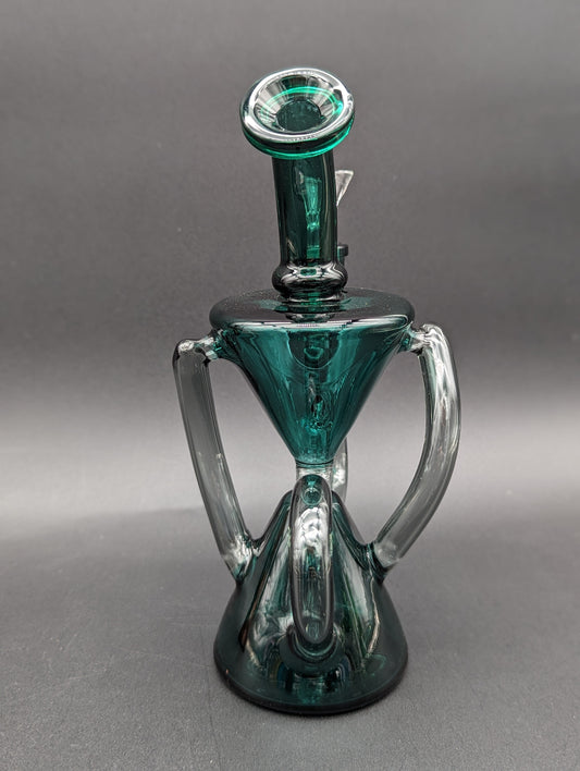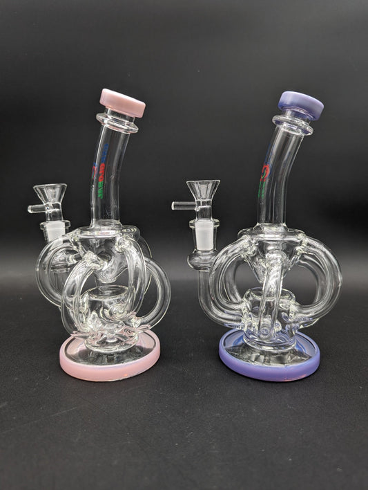 Recyclers provide a very smooth smoking experience because the water is usually brought in by one or more uptakes and pushed out through a drain in a different part of the piece. The constant hit and less "chug" that this produces makes recyclers a popular choice for dab rigs. Glass is typically used to make recyclers since they need a durable material. Additionally, we provide several incycler rigs, which are fundamentally recyclers without external tubes that recycle water inside the bong.