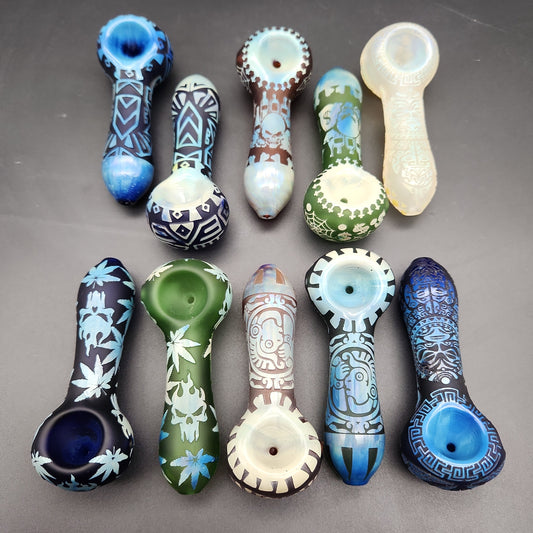 4" Etched + Sandblasted Spoon Pipes - Assorted Designs