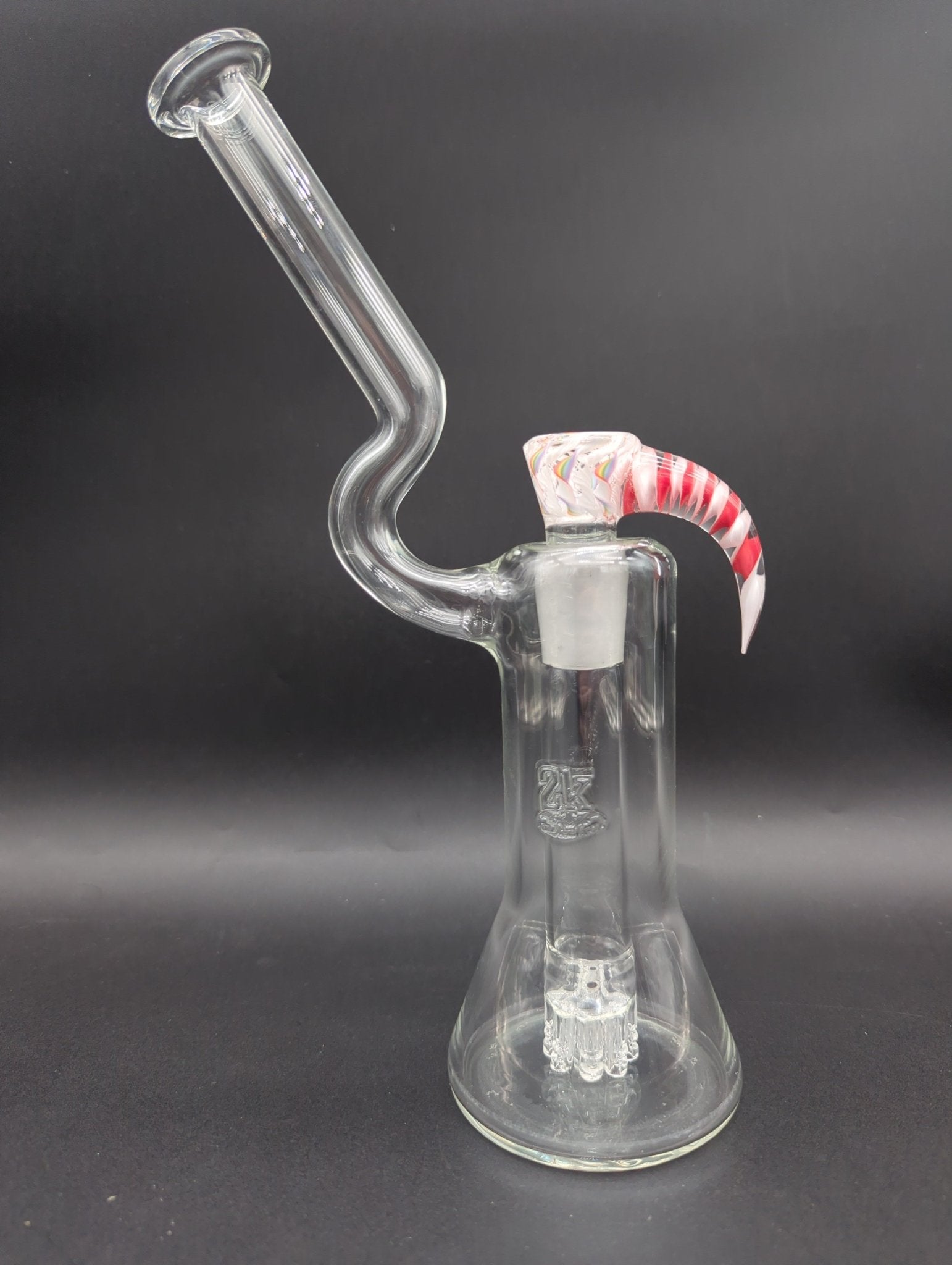 This 2K Glass Art bubbler is a unique style, with a classic standing bubbler base and an 8 arm perc at the bottom to diffuse smoke. This bubbler then has a colorful candy wig wag 4 hole slide