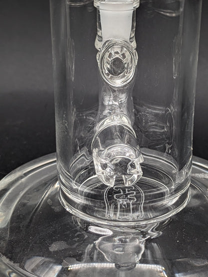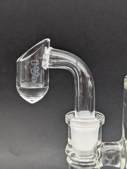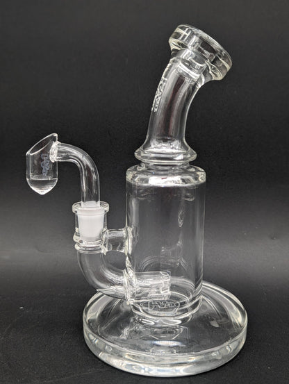 6" Tall mini rig by TAG, has a bent neck, 14mm joint and includes a banger. Hammer head diffuser perc.