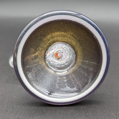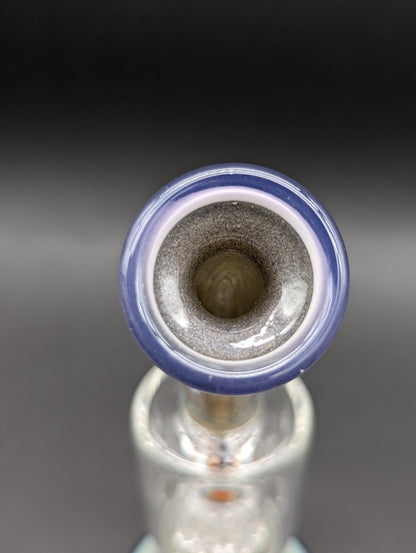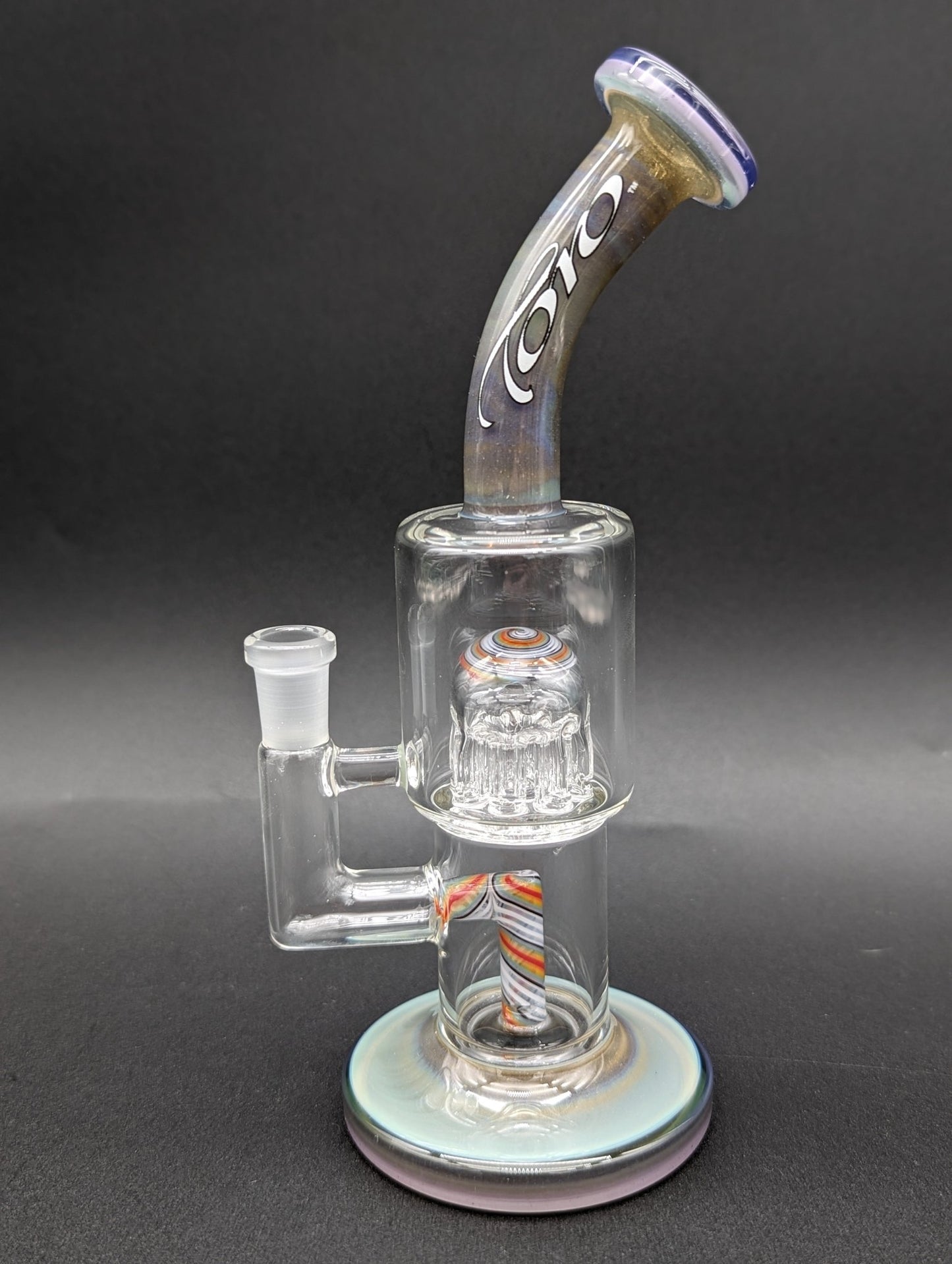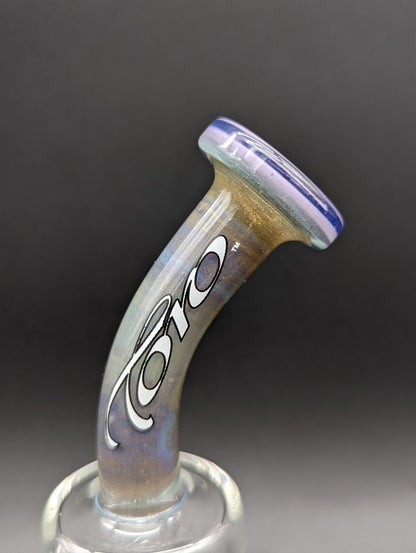 This Silver and Purple accented bent neck rig (height: 7 inches), by Toro, features a fixed 2 hole diffuser perc that smoothly transitions into a fixed 8-arm tree perc. With dual toned Sparkling Silver and Purple Base and full color mouth piece, with wig wag caps, this portable rig features a White-Scrawled Toro Logo outlined in Black.